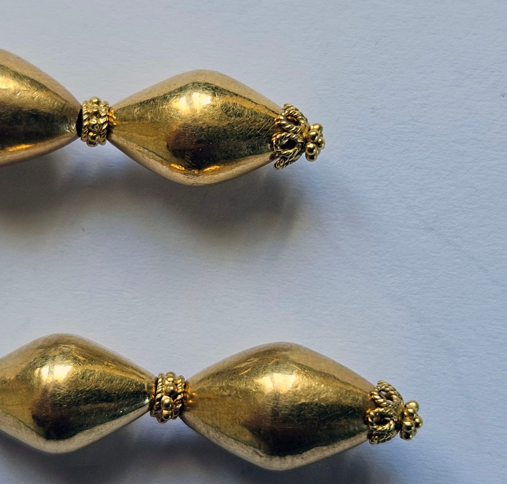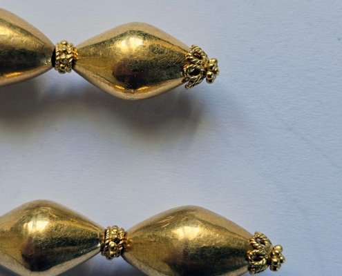 The gold beads are hollow, 23-karat gold, and filled with shellac to prevent the soft material from being dented.