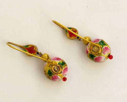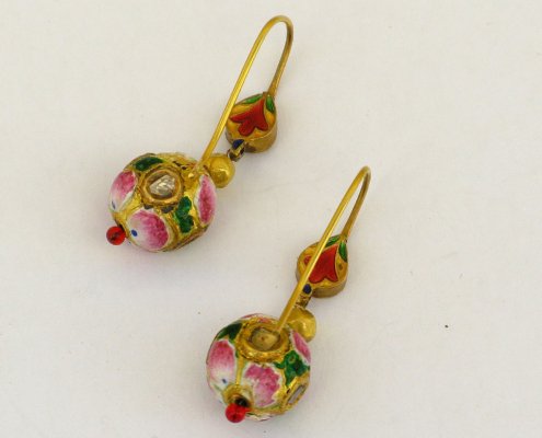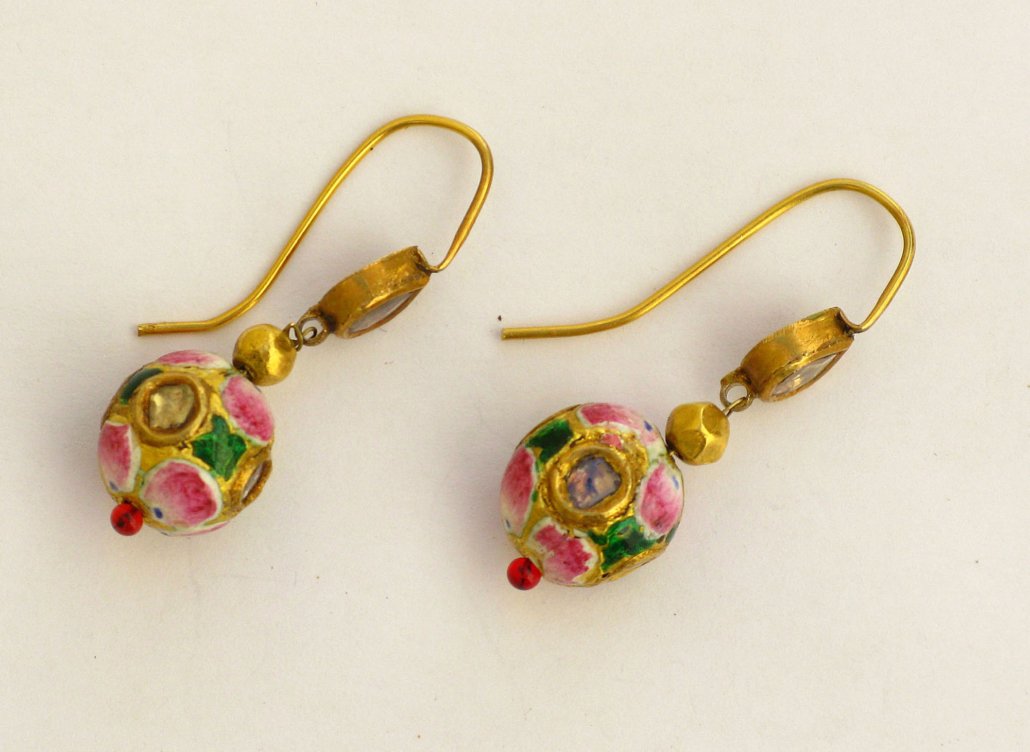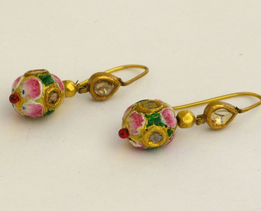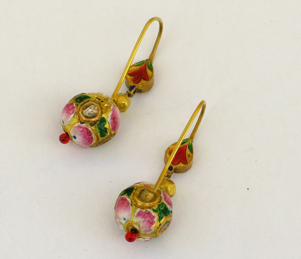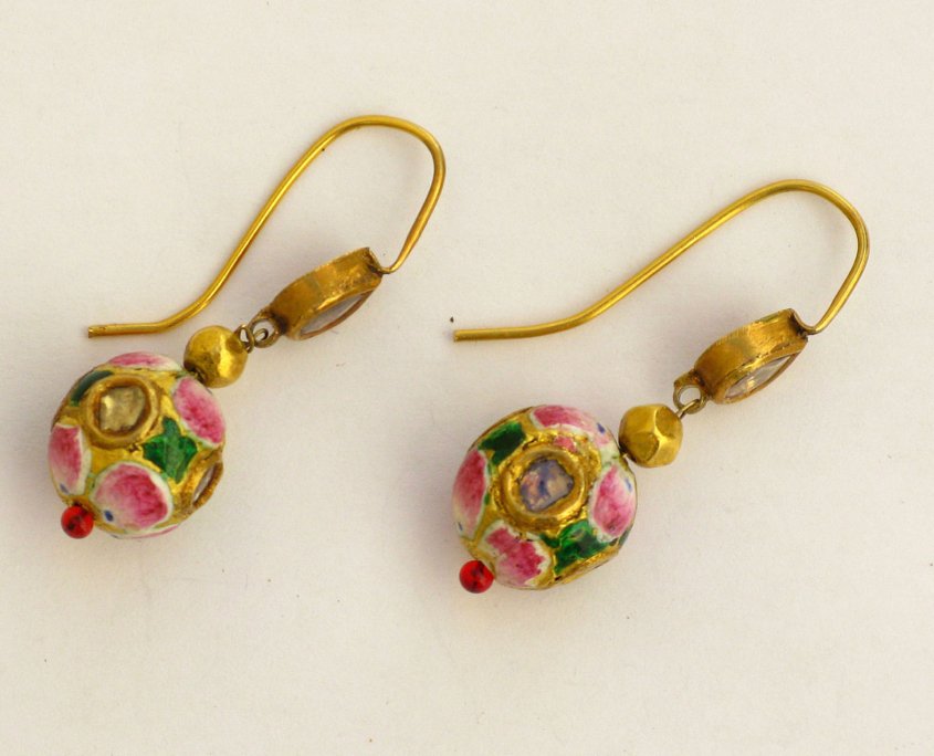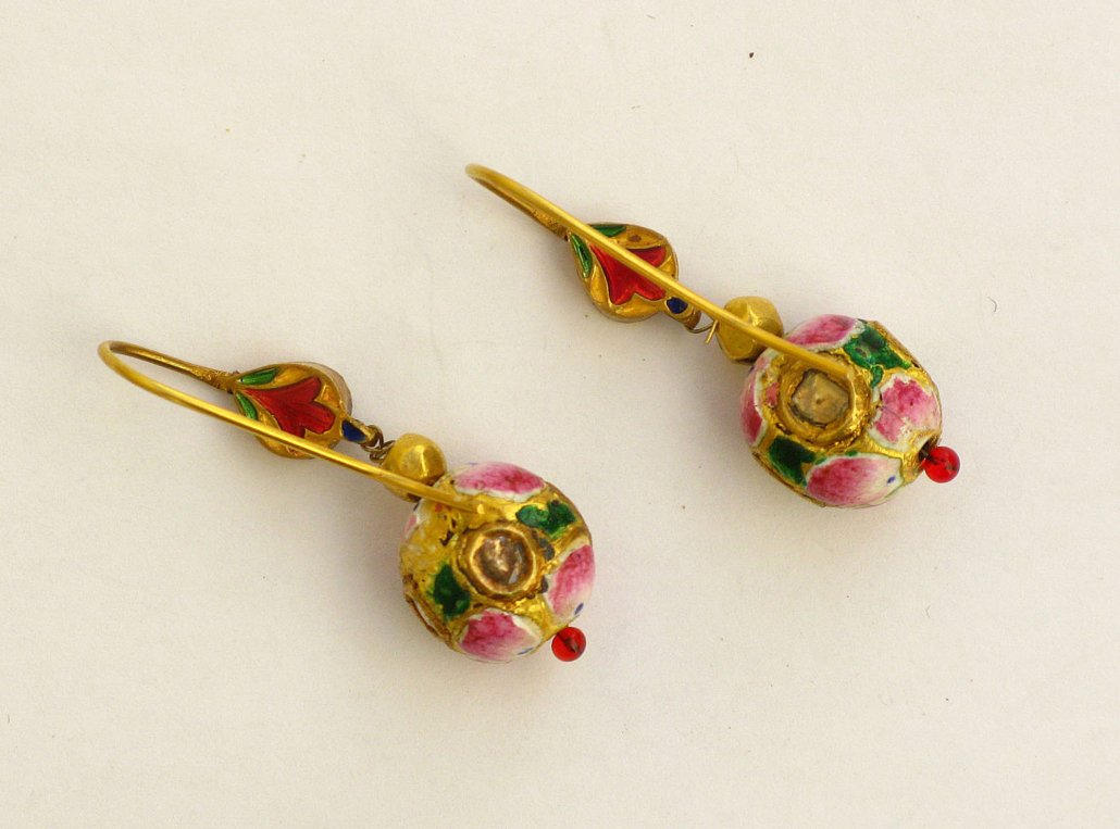 A Pair of Earornaments with gold beads (22ct) and Email (mina-work) from Benares, India