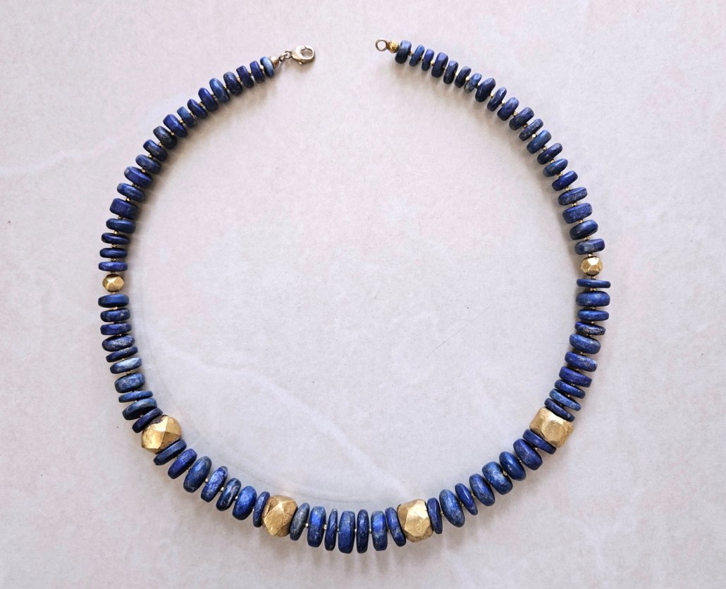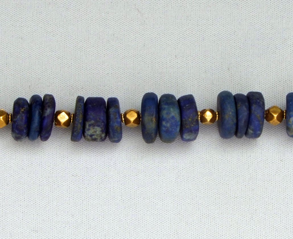 Two faceted gold elements from Gujarat add subtle contrast, while small gold spacers between the lapis discs create a balanced and elegant composition.